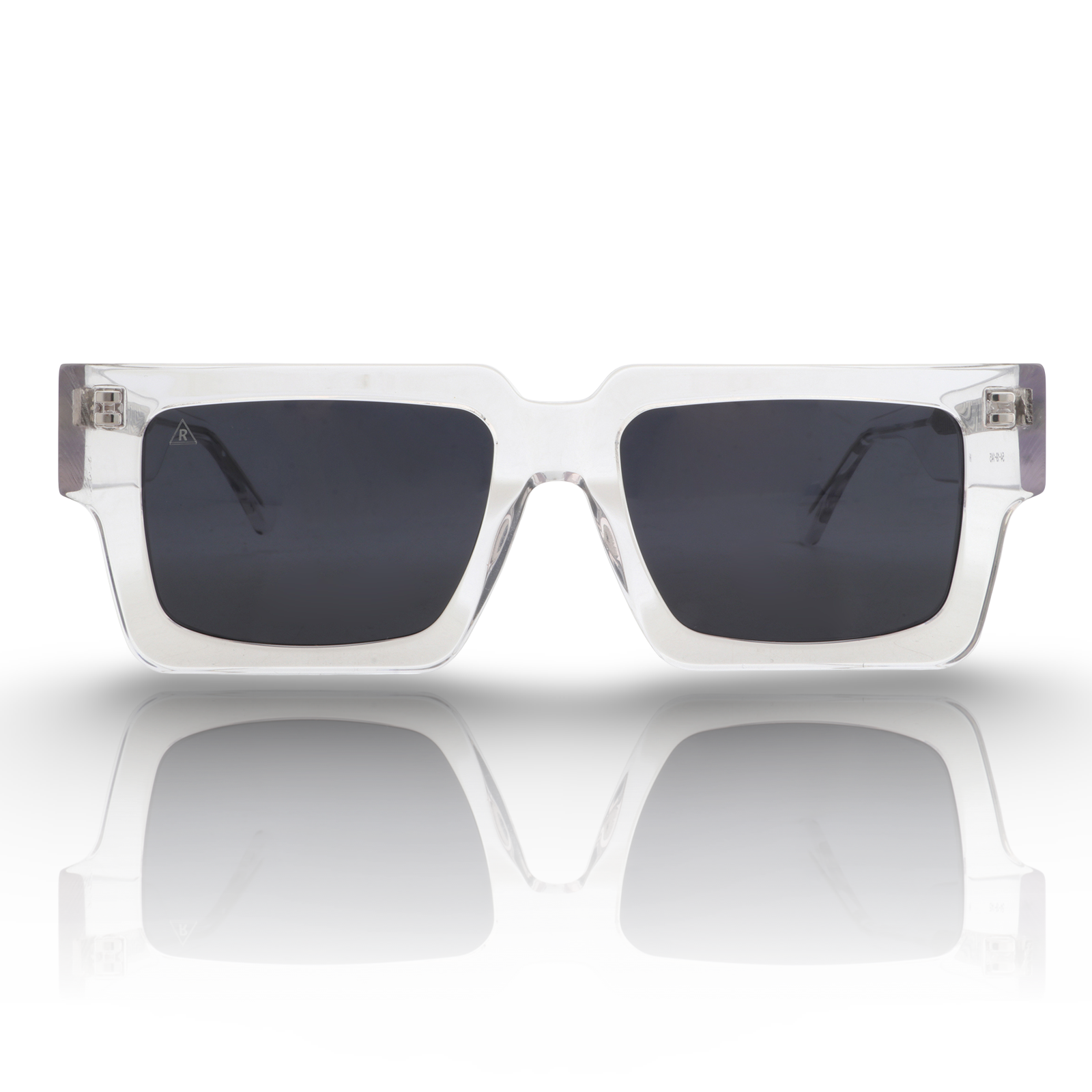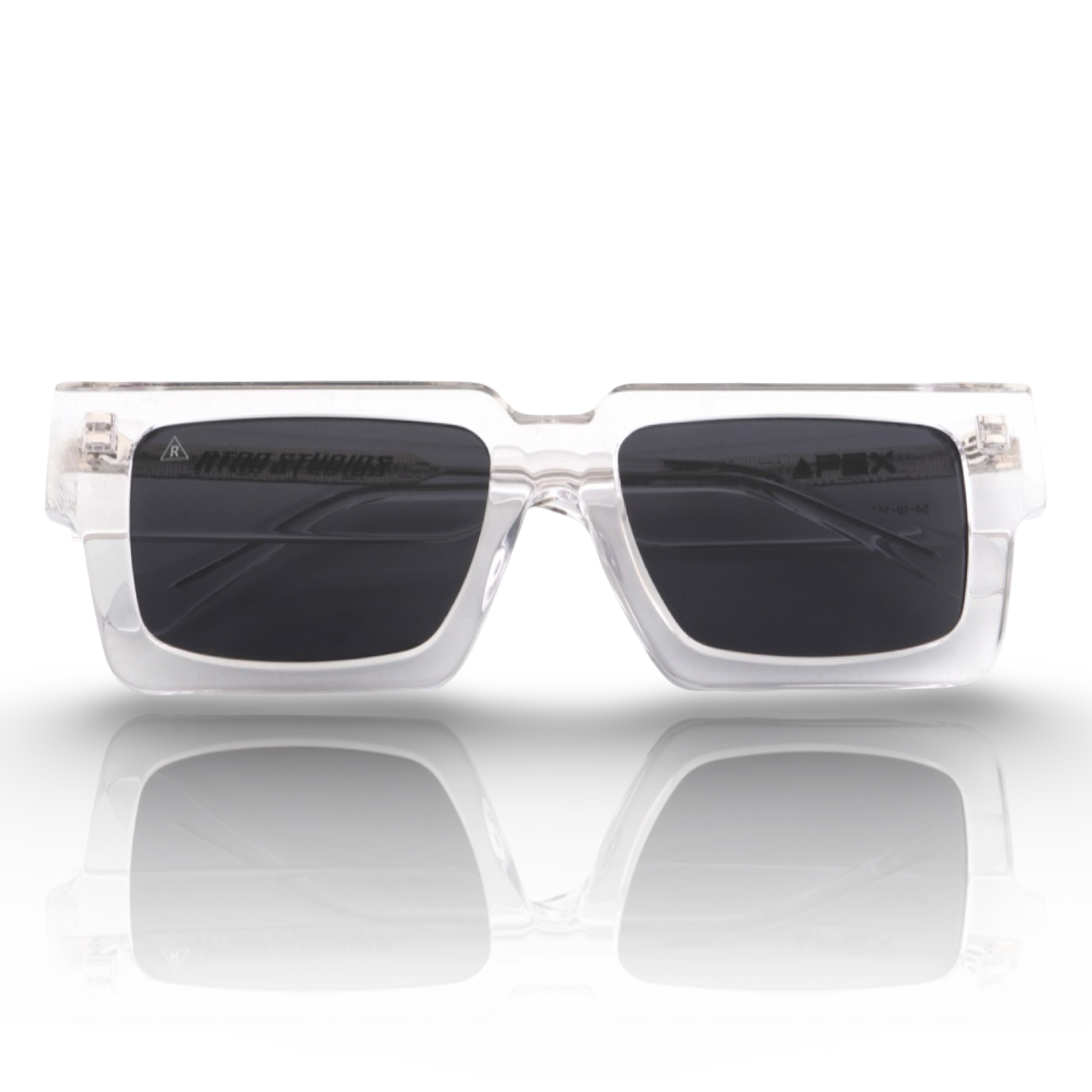 Bold silhouette reimagined in crystal clear Mazzucchelli Italian acetate. This transparent frame catches light from every angle, creating a clean, futuristic look that pairs effortlessly with any fit.
